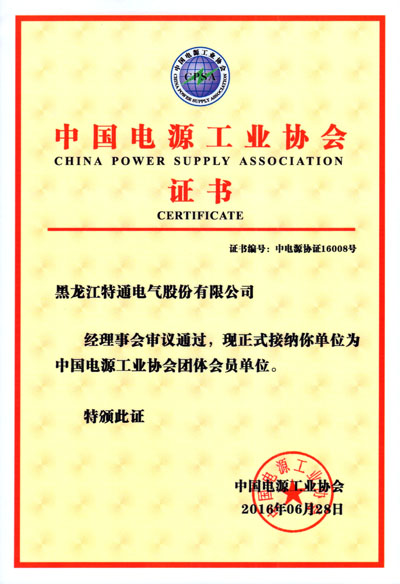 2016年06月15日特通電氣各項標準符合中國電源工業(yè)協(xié)會的要求,并成為“中國電源工業(yè)協(xié)會”會員單位。