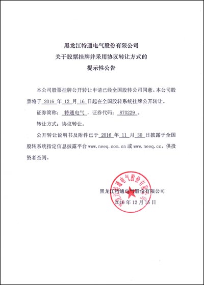 黑龍江特通電氣股份有限公司于2016年12月16日在全國中小企業股份轉讓系統(新三板)掛牌公開轉讓,證券簡稱:特通電氣,證券代碼:870229。特通電氣在全國中小企業股份轉讓系統成功掛牌,標志著公司正式進入資本市場,開啟了公司發展的新篇章。